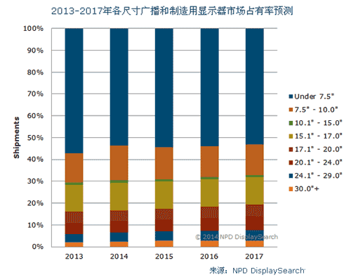 NPD DisplaySearch研究表明,2013年全球廣播及制造用顯示器(包括用于現(xiàn)場監(jiān)控、工作室顯示器和大屏幕顯示器)的出貨量超過了300,000臺。到2017年,廣播制造用顯示器出貨量的CAGR將在3%以上。其中對增長率貢獻(xiàn)最大的將是30''以上規(guī)格段顯示器,它在未來四年的出貨量將增長一倍以上。