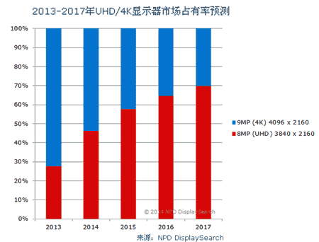 【產(chǎn)通社,6月17日訊】根據(jù)NPD DisplaySearch最新出版的專業(yè)用顯示器報(bào)告Specialty Displays Report顯示,到2017年,3840×2160分辨率的8MP超高清顯示器全球出貨量年復(fù)合增長率(CAGR)將達(dá)69%,而4096×2160的9MP 4K顯示器的CAGR僅為8%。導(dǎo)致4K顯示器增長率較低的關(guān)鍵原因是價(jià)格。比如,2013年31.5"超高清(UHD)的平均銷售價(jià)格(ASP)為$11,000,而31.1" 4K顯示器則高達(dá)$25,000。