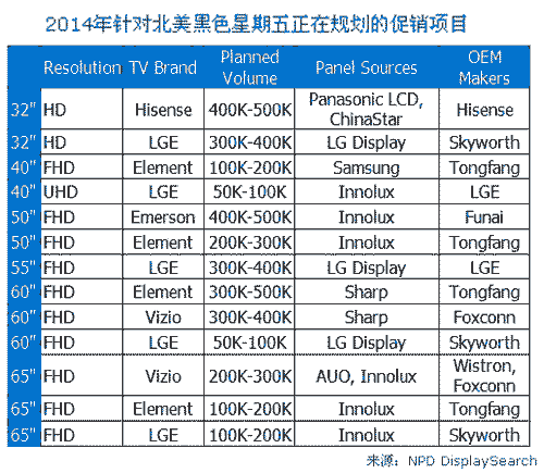 NPD DisplaySearch目前針對(duì)2014年電視品牌、整機(jī)制造商、面板廠商以及銷售通路等正在規(guī)劃的促銷機(jī)種顯示,今年各品牌規(guī)劃中的數(shù)量將高達(dá)400萬臺(tái)以上。領(lǐng)先的電視品牌和零售商自營(yíng)品牌逐漸將黑色星期五重點(diǎn)促銷機(jī)種轉(zhuǎn)向大尺寸(如55"、60"、65"等)。同時(shí)中國(guó)電視廠商也越來越重視美國(guó)市場(chǎng),如中國(guó)電視廠商同方旗下的海外子品牌Element,在美國(guó)南卡羅來納州建立了一條LCD電視生產(chǎn)線,產(chǎn)能預(yù)計(jì)將達(dá)每年200萬臺(tái)。