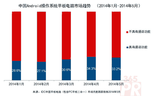 自2014年4月起,平板電腦(包含PC平板二合一,下同)市場(chǎng)的出貨量連續(xù)兩個(gè)月環(huán)比下降,平板電腦市場(chǎng)趨于平淡。截至五月份,平板電腦市場(chǎng)1至5月份出貨量合計(jì)1111百萬(wàn)臺(tái),較去年同期增長(zhǎng)了15.8%,但低于預(yù)期。其中,2-in-1(PC平板二合一)出貨量20.5萬(wàn)臺(tái),市場(chǎng)較為穩(wěn)定。Android操作系統(tǒng)的可通話平板電腦出貨量205萬(wàn)臺(tái)。其中5月份,Android操作系統(tǒng)的平板電腦中,可通話平板電腦的占比超過(guò)33%。隨著越來(lái)越多的廠商推出中小尺寸具有通話功能的平板,這一類型的產(chǎn)品將成為未來(lái)一段時(shí)間的市場(chǎng)熱點(diǎn)。2014年平板電腦市場(chǎng)呈現(xiàn)以下特點(diǎn):