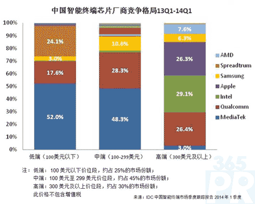 【產(chǎn)通社,6月26日訊】根據(jù)IDC最新發(fā)布的《中國智能終端市場季度跟蹤報告(2014年一季度)》,2014年一季度中國智能終端市場(包括PC,平板電腦,智能手機)出貨量約為1.2億臺,環(huán)比上升8.4%,同比上漲24.1%。IDC數(shù)據(jù)顯示,芯片廠商中聯(lián)發(fā)科在智能終端市場份額一路上漲,2014年一季度達(dá)34.6%。尤其在中低端市場(300美元以下),聯(lián)發(fā)科的份額在50%左右。位列第二的高通在中高端市場(100美元及以上)依然保持明顯優(yōu)勢。在高端市場(300美元及以上),高通、英特爾、AMD、蘋果等傳統(tǒng)知名芯片廠商紛紛匯聚于此。