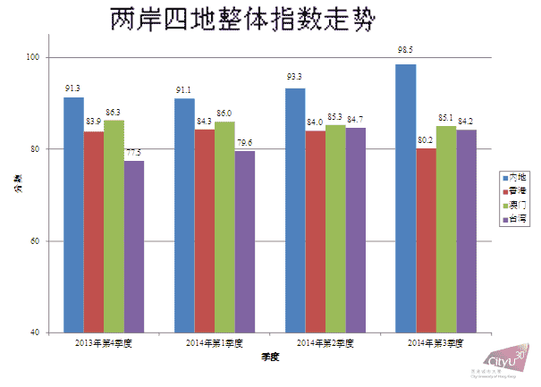將2014年第三季度的兩岸四地消費(fèi)者信心互相比較,可見(jiàn)中國(guó)內(nèi)地的信心最高(98.5分),其次是澳門(mén)(85.1分),隨后是臺(tái)灣(84.2分),而香港的信心最低(80.2分)。