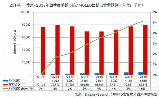 【產(chǎn)通社,11月14日訊】根據(jù)DisplaySearch全球FPD出貨量和預(yù)測(cè)季度報(bào)告 Quarterly Worldwide FPD Shipment and Forecast Report顯示,平板電腦作為OLED(有機(jī)發(fā)光二極管)面板的新應(yīng)用設(shè)備,其AMOLED(主動(dòng)矩陣有機(jī)發(fā)光二極管)2014年的出貨量預(yù)計(jì)將達(dá)500萬(wàn)片。雖然與年發(fā)貨量超過(guò)2.5億片的平板電腦面板市場(chǎng)相比,500萬(wàn)片實(shí)屬少量;但是DisplaySearch認(rèn)為,OLED面板能為平板電腦增添新價(jià)值,同時(shí)也能為相當(dāng)成熟、分散卻競(jìng)爭(zhēng)激烈的平板電腦市場(chǎng)帶來(lái)轉(zhuǎn)機(jī)。DisplaySearch預(yù)測(cè),到2015年底AMOLED將占整個(gè)平板電腦面板市場(chǎng)的5%。
