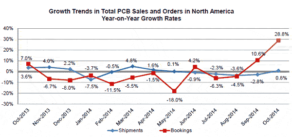 2014年10月份,北美PCB行業(yè)總出貨量同比增長了0.8%,帶動年初至今的出貨量繼續(xù)改善,增長率達(dá)到-1.0%。與上月相比,PCB總出貨量環(huán)比下降了5.2%。