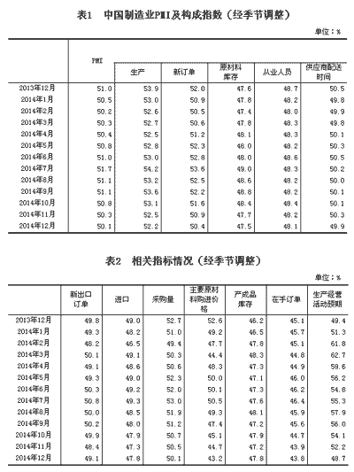 中國制造業(yè)采購經(jīng)理指數(shù)2014年12月回落為50.1%