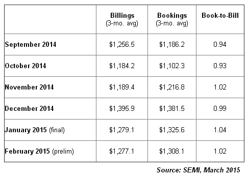【產(chǎn)通社,3月24日訊】國(guó)際半導(dǎo)體設(shè)備材料協(xié)會(huì)(SEMI)官網(wǎng)消息,2015年2月北美半導(dǎo)體設(shè)備制造商接單出貨比(Book-to-Billratio)初估為1.02、遜于1月的1.04,但為連續(xù)第2個(gè)月高于1.0。1.02意味著當(dāng)月每出貨100美元的產(chǎn)品就能接獲價(jià)值102美元的新訂單。