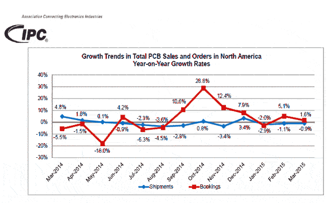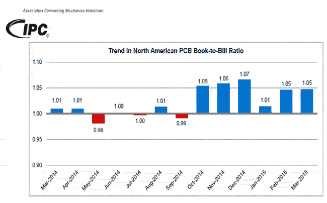 IPC市場(chǎng)調(diào)研總監(jiān)Sharon Starr女士說(shuō):“北美PCB行業(yè)的銷(xiāo)售狀況仍然延續(xù)去年的疲軟態(tài)勢(shì),但是訂單狀況已經(jīng)好于去年,有走強(qiáng)的態(tài)勢(shì)。三月份訂單與銷(xiāo)售雙雙走強(qiáng)是受正常的周期性需求影響;訂單出貨比在過(guò)去六個(gè)月都處在良性區(qū)域,這對(duì)2015年第二、三季度的銷(xiāo)量是個(gè)積極的信號(hào)。“