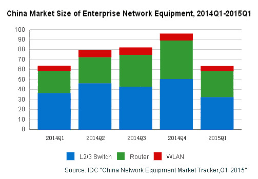 【產(chǎn)通社,7月23日訊】2015年第一季度交換機(jī)在企業(yè)網(wǎng)和運(yùn)營商市場首次出現(xiàn)季度同比下降,而WLAN則在企業(yè)網(wǎng)市場大幅增長。IDC最新發(fā)布的《2015年第一季度中國網(wǎng)絡(luò)設(shè)備市場跟蹤報(bào)告》顯示,2015年第一季度中國企業(yè)級(jí)網(wǎng)絡(luò)設(shè)備市場規(guī)模為63.4億元人民幣,環(huán)比下降34.0%,同比下降0.8%;綜合企業(yè)網(wǎng)和運(yùn)營商市場來看,L2/3交換機(jī)同比下降11.6%,路由器同比增長17.3%,WLAN同比下降2.7%。