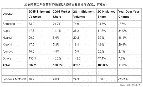 【產(chǎn)通社,8月1日訊】IDC報(bào)告顯示,2015年第二季全球智能手機(jī)出貨量達(dá)3.37億支,比去年同期的3.02億支,年成長率達(dá)11.6%。前五大智能型手機(jī)廠商當(dāng)中,蘋果、華為與小米的年成長率都超過29%以上,表現(xiàn)非常亮眼。至于整體手機(jī)表現(xiàn)上,2015年第二季的出貨量達(dá)到4.65億支,比2014年第二季的4.66億支,年成長率衰退0.4%,表明一般功能手機(jī)依舊受到低價(jià)智能手機(jī)的沖擊,正在進(jìn)一步衰退中。