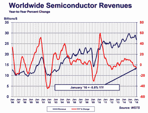 2016年1月全球半導體銷售269億美元年比下降5.8%