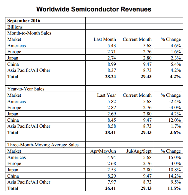 【產(chǎn)通社,11月22日訊】美國(guó)半導(dǎo)體產(chǎn)業(yè)協(xié)會(huì)(Semiconductor Industry Association, SIA)官網(wǎng)消息,2016年第三季度(7-9月)銷售額為883億美元,創(chuàng)下該季度銷售額歷史最高記錄,季增幅度高達(dá)11.5%。半導(dǎo)體銷售額近來(lái)急速增長(zhǎng),2016年9月全球半導(dǎo)體銷售額為294.3億美元,年增3.6%,月增4.2%。 地區(qū)來(lái)看,9月所有地區(qū)均出現(xiàn)逐月增幅,增幅依次為中國(guó)(5.4%)、美洲(4.6%)、亞太/所有其他(4.2%)、日本(2.3%)、歐洲(1.6%)。 同去年相比,中國(guó)增幅依然最大為12.0%,氣候依次為日本(4.2%)、亞太/所有其他(1.7%),但是美洲和歐洲的數(shù)字出現(xiàn)下降,美洲為-2.4%,歐洲為-4.0%。 查詢進(jìn)一步信息,請(qǐng)?jiān)L問(wèn)官方網(wǎng)站 http://www.semiconductors.org/。(Lisa WU,365PR Newswire)