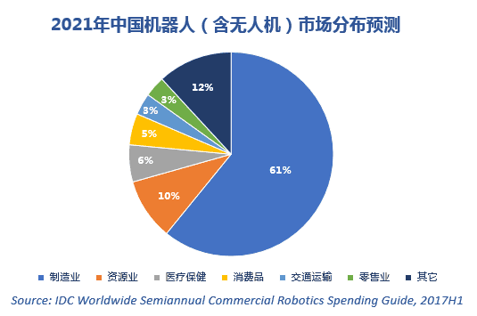 從機器人技術(shù)成分來看,中國市場的機器人系統(tǒng)支出包括了工業(yè)機器人、商用服務(wù)機器人和消費型機器人本體,以及售后市場相關(guān)硬件,這部分支出在2021年達到465億美元(約合2940億元人民幣)。數(shù)據(jù)顯示,中國企業(yè)對工業(yè)機器人的需求持續(xù)強勁,2017年制造業(yè)機器人市場規(guī)模占整體市場61%以上。