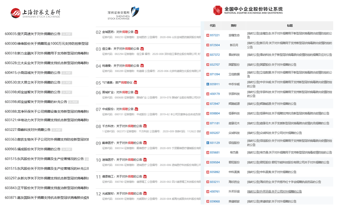 【產(chǎn)通社,2月9日訊】張底剪報數(shù)據(jù)顯示,截至2月8日已有183家國內(nèi)上市公司為抗擊新型冠狀病毒肺炎疫情捐款、捐物。其中,深交所(SZSE)上市公司103家,上交所上市公司63家,新三板(NEEQ)上市公司17家。 根據(jù)183家公司發(fā)布的公告,面對復(fù)雜的新冠病毒肺炎疫情,為支持國家有效防控和保障人民生命安全,他們勇于擔(dān)當(dāng)切實(shí)履行社會責(zé)任,積極為打贏新型冠狀病毒肺炎疫情防控戰(zhàn)役貢獻(xiàn)力量。(Jack, 產(chǎn)通互聯(lián)網(wǎng)) 附件1: 深交所(SZSE)上市公司抗新冠肺炎(NCP)疫情捐贈公告名單(截至2月8日): 002516  曠達(dá)科技  關(guān)于對外捐贈支持抗擊新型冠狀病毒肺炎疫情的公告 (91k)   2020-02-08 002601  龍蟒佰利關(guān)于對外捐贈的公告 (241k)   2020-02-08    300268  佳沃股份關(guān)于對外捐贈支持防控新型冠狀病毒肺炎疫情的公告 (167k)   2020-02-08 002424  貴州百靈  關(guān)于對外捐贈支持抗擊新型冠狀病毒肺炎疫情的公告 (85k)   2020-02-08 000488  晨鳴紙業(yè)  關(guān)于對外捐贈用于支持抗擊新型冠狀病毒肺炎的公告 (152k)   2020-02-08 002556  輝隆股份  關(guān)于對外捐贈用于支持新型冠狀病毒肺炎疫情防控的公告 (214k)   2020-02-08 002693  雙成藥業(yè)  關(guān)于抗擊新型冠狀病毒肺炎對外捐贈的公告 (69k)   2020-02-08 002881  美格智能  關(guān)于對外捐贈支持抗擊新型冠狀病毒肺炎疫情的公告 (116k)  2020-02-08 000012  南玻A  關(guān)于捐贈防控資金物資支持抗擊新型冠狀病毒肺炎疫情的公告 (334k)   2020-02-08 000899  贛能股份  關(guān)于對外捐贈支持抗擊新型冠狀病毒肺炎疫情的公告 (125k)   2020-02-08 300149  量子生物  關(guān)于對外捐贈微生態(tài)調(diào)節(jié)劑益生元用于支持新型冠狀病毒肺炎疫情防控的公告 (69k)   2020-02-07 15:38 300289  利德曼  關(guān)于對外捐贈的公告 (108k)   2020-02-07 11:43 002185  華天科技  關(guān)于對外捐贈支持新型冠狀病毒感染肺炎疫情防控的公告 (112k)   2020-02-07 11:40 002864  盤龍藥業(yè)  關(guān)于對外捐贈支持抗擊新型冠狀病毒肺炎疫情的公告 (205k)   2020-02-07 07:50 002942  新農(nóng)股份  關(guān)于對外捐贈支持抗擊新型冠狀病毒肺炎疫情的公告 (170k)   2020-02-07 002131  利歐股份  關(guān)于對外捐贈支持抗擊新型冠狀病毒肺炎疫情的公告 (201k)   2020-02-07 002312  三泰控股  關(guān)于對外捐贈用于支持新型冠狀病毒肺炎疫情防控的公告 (257k)   2020-02-07 002753  永東股份  關(guān)于對外捐贈支持抗擊新型冠狀病毒肺炎疫情的公告 (66k)   2020-02-07 002335  科華恒盛  關(guān)于對外捐贈支持抗擊新型冠狀病毒肺炎疫情的公告 (119k)   2020-02-07 000829  天音控股  關(guān)于對外捐贈及相關(guān)事項(xiàng)的公告 (122k)   2020-02-07 002171  楚江新材  關(guān)于對外捐贈物資用于新型冠狀病毒肺炎疫情防控的公告 (223k)   2020-02-07 002078  太陽紙業(yè)  關(guān)于對外捐贈支持抗擊新型冠狀病毒肺炎疫情的公告 (142k)   2020-02-07 002262  恩華藥業(yè)  關(guān)于對外捐贈的公告 (121k)   2020-02-07 002433  太安堂  關(guān)于控股子公司對外捐贈的公告 (140k)   2020-02-07 002001  新 和 成  關(guān)于對外捐贈的公告 (60k)   2020-02-07 300152  科融環(huán)境  關(guān)于向北京豐利公益基金會捐贈暨關(guān)聯(lián)交易的進(jìn)展公告 (66k)   2020-02-06 17:56 002340  格林美  關(guān)于對外捐贈支持抗擊新型冠狀病毒肺炎疫情的公告 (314k)   2020-02-06 002524  光正集團(tuán)  關(guān)于對外捐贈支持抗擊新型冠狀病毒肺炎疫情的公告 (76k)   2020-02-06 002802  洪匯新材  關(guān)于對外捐贈的公告 (165k)   2020-02-06 002446  盛路通信  關(guān)于對外捐贈支持抗擊新型冠狀病毒肺炎疫情的公告 (125k)  002427  *ST尤夫  關(guān)于對外捐贈用于新型冠狀病毒肺炎疫情防控的公告 (160k)   2020-02-06  300587  天鐵股份  關(guān)于對外捐贈支持抗擊新型冠狀病毒肺炎疫情的公告 (276k)   2020-02-05 17:11  300254  仟源醫(yī)藥  關(guān)于對外捐贈支持防控新型冠狀病毒感染肺炎疫情的公告 (70k)   2020-02-05 15:45 300396  迪瑞醫(yī)療  關(guān)于對外捐贈的公告 (273k)   2020-02-05 15:44 002973  僑銀環(huán)保  關(guān)于公司擬捐贈2000萬元設(shè)立公益基金會的公告 (183k)   2020-02-05 000729  燕京啤酒  關(guān)于對外捐贈用于新冠肺炎疫情防控的公告 (74k)   2020-02-05 300260  新萊應(yīng)材  關(guān)于對外捐贈支持抗擊新型冠狀病毒肺炎疫情的公告 (120k)   2020-02-05 002363  隆基機(jī)械  關(guān)于對外捐贈支持抗擊新型冠狀病毒肺炎疫情的公告 (66k)   2020-02-05 002057  中鋼天源  關(guān)于對外捐贈用于支持抗擊新型冠狀病毒肺炎疫情的公告 (74k)   2020-02-05 002456  歐菲光  關(guān)于捐贈2000萬元支持新型冠狀病毒肺炎疫情防控的自愿性信息披露公告 (122k)   2020-02-05 300699  光威復(fù)材  關(guān)于對外捐贈的公告 (67k)   2020-02-05 002246  北化股份  對外捐贈的公告 (87k)   2020-02-05 000672  上峰水泥  關(guān)于對外捐贈支持抗擊新型冠狀病毒疫情防控的公告 (80k)   2