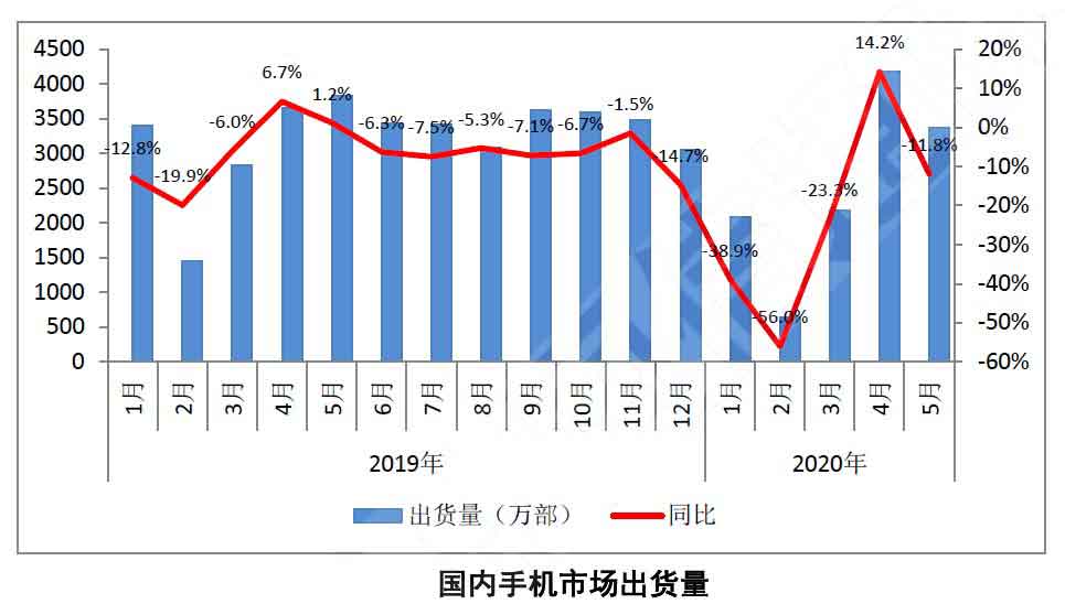 【產(chǎn)通社,6月28日訊】中國(guó)信息通信研究院(CAICT)最新統(tǒng)計(jì)數(shù)據(jù)顯示,2020年5月國(guó)內(nèi)手機(jī)市場(chǎng)總體出貨量3375.9萬(wàn)部,同比下降11.8%;1-5月,國(guó)內(nèi)手機(jī)市場(chǎng)總體出貨量累計(jì)1.24億部,同比下降18.0%。