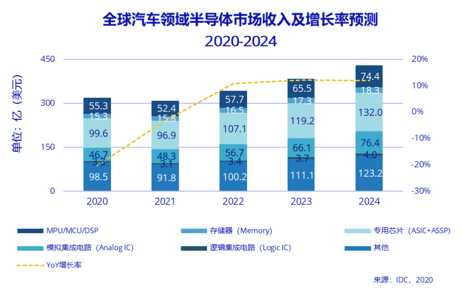 汽車芯片的技術(shù)進(jìn)步依賴于半導(dǎo)體市場的發(fā)展,IDC預(yù)計(jì)未來5年半導(dǎo)體在汽車芯片領(lǐng)域的應(yīng)用將保持快速增長。根據(jù)《IDC全球半導(dǎo)體應(yīng)用預(yù)測(2020–2024)》數(shù)據(jù),2020年全球汽車領(lǐng)域的半導(dǎo)體市場收入約為319億美元,2024年將達(dá)到約428億美元,2020至2024年的年均復(fù)合增長率(CAGR)為7.7%。預(yù)計(jì)新冠肺炎疫情對(duì)市場的沖擊將持續(xù)1-2年,2022至2024年,全球汽車領(lǐng)域半導(dǎo)體市場將實(shí)現(xiàn)兩位數(shù)的同比增長,其中專用芯片和模擬IC(Analog IC)芯片的市場份額將不斷擴(kuò)大。