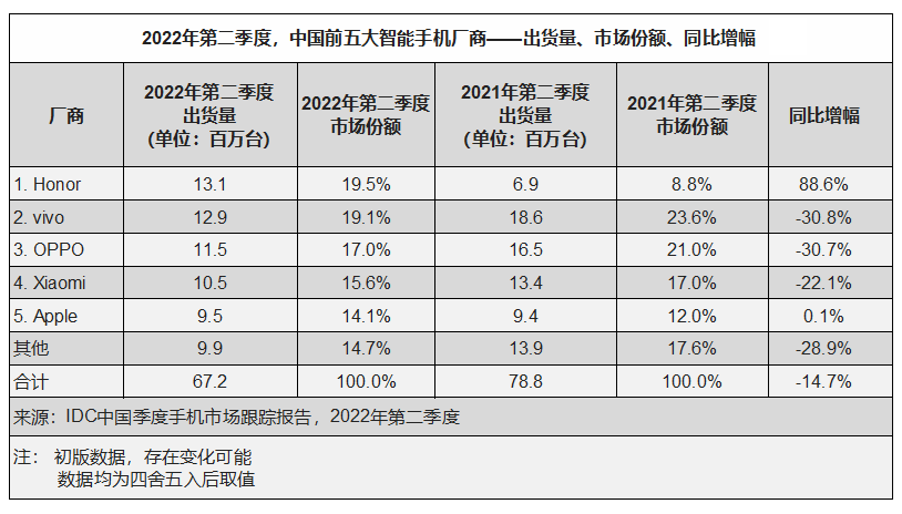 【產(chǎn)通社,7月30日訊】國際數(shù)據(jù)公司(IDC)手機(jī)季度跟蹤報(bào)告顯示,2022年第二季度,中國智能手機(jī)市場出貨量約6,720萬臺(tái),同比下降14.7%。上半年國內(nèi)智能機(jī)市場出貨量約1.4億臺(tái),同比下降14.4%。 Honor 在第二季度排名國內(nèi)市場出貨量第一。在新品榮耀70系列上市的帶動(dòng)下,繼續(xù)維持了高速增長的勢頭。其他產(chǎn)品系列中,暢玩30系列、Play 6系列等普惠型產(chǎn)品成功抓住了入門級(jí)市場需求;同時(shí),Magic 4系列等產(chǎn)品,也在高端市場(600美金以上,不含稅基準(zhǔn),下同)幫助榮耀持續(xù)擴(kuò)大市場份額。 vivo位居第二,19.1%的市場份額環(huán)比第一季度亦有所提升。得益于iQOO旗艦系列在6月線上市場的良好表現(xiàn),以及vivo X系列新品在線上與線下市場所獲得的高認(rèn)可度,vivo在第二季度的高端市場份額達(dá)到了近一年來的最高點(diǎn)。 OPPO繼續(xù)延續(xù)了Reno、A系列的爆款策略,Reno 8系列、A57等熱門產(chǎn)品單季度出貨量均超過兩百萬部。其中,Reno 8系列幫助OPPO繼續(xù)在第二季度國內(nèi)中端市場(200-400美金,不含稅基準(zhǔn))保持領(lǐng)先的地位。 Xiaomi在第二季度出貨量約1,050萬部。自5月份開始,隨著市場大盤的回暖與促銷季臨近, Redmi K系列、Redmi Note系列成為了小米的主要驅(qū)動(dòng)力。另外,“6.18”期間的價(jià)格調(diào)整,也助力高端價(jià)位段小米12系列的銷量增長。小米市場份額相比上個(gè)季度同樣有所提升。 Apple在“6.18”期間,通過京東等主要渠道對iPhone 13給出了較大幅度的降價(jià),同時(shí)亦調(diào)整上一代產(chǎn)品在線上渠道銷售中的占比。利用這些策略,將iPhone 13打造成為“爆款”。iPhone 13在第二季度占據(jù)Apple出貨量6成以上,幫助Apple在市場大盤低迷的背景下,依舊獲取了同比正增長的表現(xiàn)。 上半年,國內(nèi)智能手機(jī)整體市場呈現(xiàn)低迷狀態(tài),但折疊屏細(xì)分領(lǐng)域保持了高速增長的態(tài)勢。2022年上半年,國內(nèi)折疊屏產(chǎn)品出貨量超過110萬部,同比增幅約70%。 分廠商來看,雖然供應(yīng)受限,但華為依舊憑借強(qiáng)大的品牌與產(chǎn)品力,占據(jù)國內(nèi)折疊屏市場超過63%的份額;OPPO憑借Find N具有顯著差異化的產(chǎn)品設(shè)計(jì),以及較強(qiáng)的價(jià)格競爭力,位列折疊屏市場第二的位置;三星的Z Flip3,Z Fold3兩款產(chǎn)品已接近生命周期尾聲,排名第三;榮耀、vivo的供貨策略相對保守,分列第四、第五位。 IDC認(rèn)為,上半年國內(nèi)智能市場低迷,除去疫情反彈、封控等“外因”影響消費(fèi)者預(yù)算之外,中高端產(chǎn)品缺乏足夠的差異化,使用體驗(yàn)難以打動(dòng)消費(fèi)者也是重要的“內(nèi)因”。在逆風(fēng)市場環(huán)境中,折疊屏產(chǎn)品平均單價(jià)雖遠(yuǎn)高于平均水平,且部分軟件體驗(yàn)仍有較大提升空間,但該細(xì)分市場能夠快速增長,甚至部分產(chǎn)品依然呈現(xiàn)供不應(yīng)求的勢頭,體現(xiàn)出擁有足夠差異化的產(chǎn)品,依然可以打動(dòng)消費(fèi)者。因此,未來整體市場雖然挑戰(zhàn)巨大,但專注于產(chǎn)品體驗(yàn)的提升,仍將是行業(yè)參與者應(yīng)重點(diǎn)關(guān)注的方向。 查詢進(jìn)一步信息,請?jiān)L問官方網(wǎng)站 http://www.idc.com.cn,或發(fā)email至frankwang@idc.com。(張怡,產(chǎn)通發(fā)布)