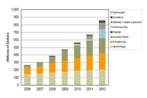 手機(jī)中的其它MEMS應(yīng)用包括MEMS振蕩器,如Toyocom公司的Q-MEMS;高通的MEMS iMoD顯示器;RFMD、Epcos或Wispry公司的RF MEMS開(kāi)關(guān),到2012年可能還會(huì)進(jìn)入微型燃料電池。
