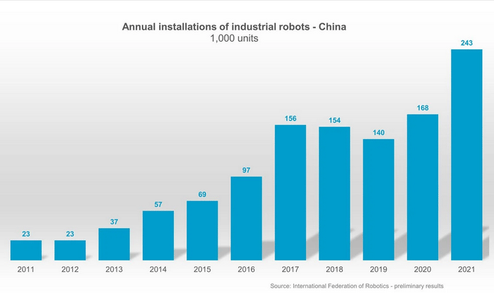 國際機器人聯(lián)合會(IFR)稱中國機器人安裝量2021年增長了44%