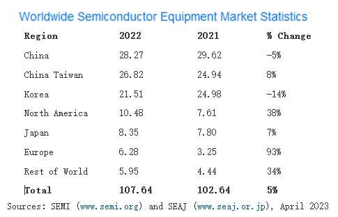 【產通社,5月15日訊】SEMI在其發(fā)布的《全球半導體設備市場報告》Worldwide Semiconductor Equipment Market Statistics (WWSEMS) Report中宣布,2022年全球半導體制造設備出貨金額相較2021的1026億美元增長5%,創(chuàng)下1076億美元的歷史新高。 2022年,中國大陸連續(xù)第三年成為全球最大的半導體設備市場,2022年中國大陸的投資同比放緩5%,為283億美元。中國臺灣地區(qū)是第二大設備支出地區(qū),2022年增長8%,達到268億美元,這標志著該地區(qū)連續(xù)第四年增長。韓國的設備銷售額下降了14%,為215億美元。歐洲的年度半導體設備投資激增93%,北美增長了38%。世界其他地區(qū)和日本的銷售額分別同比增長34%和7%。 SEMI總裁兼首席執(zhí)行官Ajit Manocha表示:“2022年半導體制造設備銷售額創(chuàng)下歷史新高,源于產業(yè)努力增加所需的晶圓廠產能,以支持包括高性能計算和汽車在內的關鍵終端市場的長期增長和創(chuàng)新。此外,這些結果反映了各地區(qū)的投資和決心,以避免未來的半導體供應鏈限制,就像疫情期間出現(xiàn)的那樣。” 2022年,晶圓加工設備的全球銷售額增長了8%,而其它前端領域的銷售額增長了11%。在2021強勁增長后,封裝設備銷售額去年下降了19%,測試設備總銷售額同比下降了4%。(來源:SEMI;編輯:張怡)