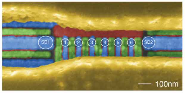 六量子位量子處理器。這些量子位是通過調(diào)整芯片上紅色、藍(lán)色和綠色導(dǎo)線的電壓產(chǎn)生的。被稱為SD1和SD2的結(jié)構(gòu)是極其敏感的電場傳感器,甚至可以檢測到單個電子的電荷。這些傳感器與先進的控制方案一起允許研究人員將單個電子放置在標(biāo)記為(1)-(6)的位置,然后作為量子位進行操作。