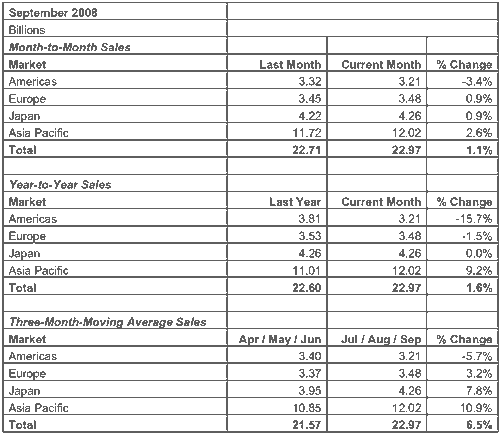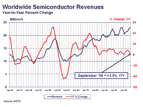“由于業(yè)界開始感受到全球金融市場動(dòng)蕩的影響,9月半導(dǎo)體銷售成長率已減緩,”SIA總裁George Scalise在聲明中說。“由于消費(fèi)者信心大幅下降,企業(yè)界態(tài)度謹(jǐn)慎,短期內(nèi)面臨不確定性!