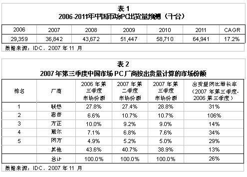 IDC的這次調(diào)查的樣本選自全國范圍內(nèi)各個級別城市的個人消費(fèi)者和企業(yè)用戶,并將渠道研究(包括大量銷售家用PC的賣場)以及對PC上游部件出貨量的研究作為補(bǔ)充。本次調(diào)查的主要目的是進(jìn)一步深度研究“白牌” PC市場的購買決定因素,了解PC的生命周期、價格敏感性、配置、分銷渠道和不同的終端用戶子市場。這一報告還為廠商提供了如何在中國市場取得進(jìn)一步發(fā)展的相關(guān)戰(zhàn)略和建議。