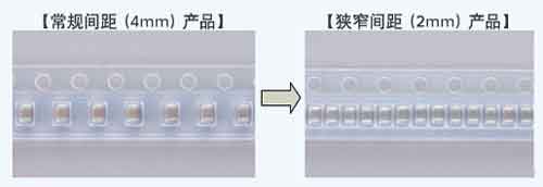 至今為止的0805尺寸是間距4mm的壓紋帶,330Φ的卷筒每卷是10,000個,但是使用窄間距(2mm)的壓紋帶的話,同樣330Φ的卷筒能夠卷裝兩倍數(shù)量的20,000個。通過使用這種壓紋帶,能夠?yàn)榄h(huán)保和節(jié)省空間作出了貢獻(xiàn)。在減少客戶交換卷筒的勞力和時(shí)間的同時(shí),也能夠把到0805尺寸的22µF為止的產(chǎn)品在同一壓紋帶上進(jìn)行壓裝。