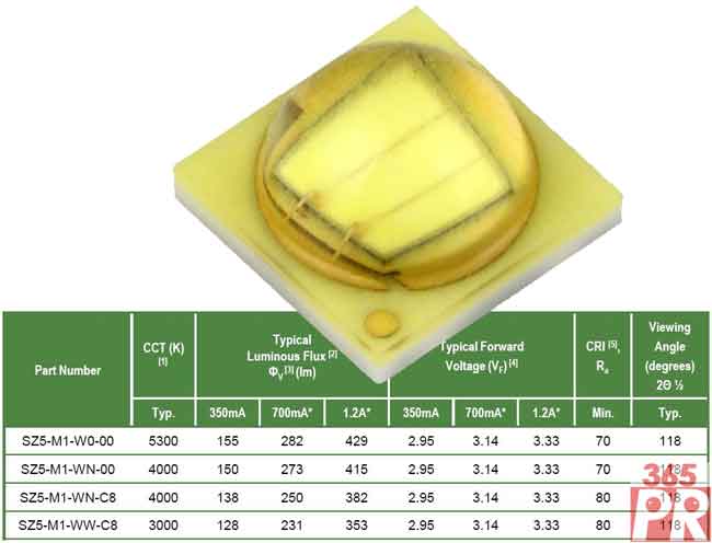 Z5M1系列中性能改善最大的是照明用暖白產(chǎn)品。色溫2,600-3,700K,暖白,室溫25攝氏度(Typ.),350mA電流條件下亮度達到128lm,700mA的電流條件下達到231lm,1.2A電流條件下則可達到353lm,亮度比市場平均水平高出了10%。色溫5,000K,冷白,室溫25攝氏度(Typ.),350mA電流條件下亮度達到155lm,700mA電流條件下達到282lm,1.2A電流條件下則可達到429lm,是業(yè)界同等級高功率LED產(chǎn)品中的最高亮度。