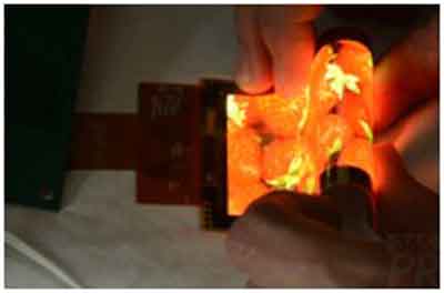 該顯示屏采用LTPS TFT背板技術(shù),并應(yīng)用了公司自主知識(shí)產(chǎn)權(quán)的透明陰極和OLED器件技術(shù),其屏體顯示尺寸為3.5吋,厚度為22μm,重量不足0.2g,彎曲半徑小于5mm。