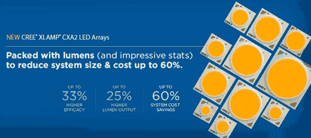 新型XLamp CXA2 LED陣列比之前代產(chǎn)品,能夠使得照明生產(chǎn)商在更小的發(fā)光表面LES實(shí)現(xiàn)相同甚至更高的性能。舉個(gè)例子,3800lm/19mm發(fā)光表面LES的LED能夠被12mm發(fā)光表面LES的LED所替代,從而可以通過減少LED使用數(shù)量、降低機(jī)械和光學(xué)材料成本,實(shí)現(xiàn)最高60%系統(tǒng)成本降低。