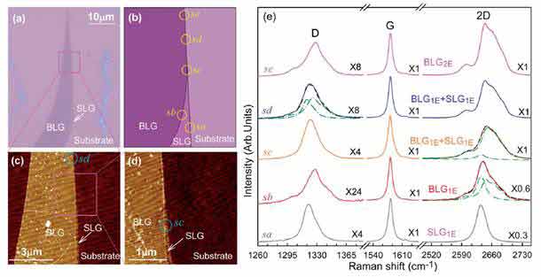 最近,中科院半導(dǎo)體所博士生張昕、厲巧巧和譚平恒研究員等人,對(duì)MLG邊界的拉曼散射進(jìn)行了系統(tǒng)研究。他們首先對(duì)MLG邊界進(jìn)行了歸類,發(fā)現(xiàn)N層石墨烯(NLG)的基本邊界類型為NLGjE,即具有完美邊界的jLG置于(N-j) LG上。因此,雙層石墨烯(BLG)的邊界情況可分為BLG1E+SLG1E和BLG2E兩種情況。研究發(fā)現(xiàn):