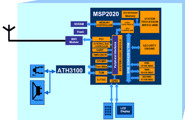 對于潛在的VoIP用戶而言,通過公共互聯(lián)網(wǎng)進(jìn)行電話通話的安全性是他們考慮的一個主要問題,因此OEM和ODM必須為終端用戶提供具有安全功能的產(chǎn)品。MSP2020帶有一個整合的硬體安全引擎,可以對呼叫建立訊息與語音頻道數(shù)據(jù)流進(jìn)行加密,保證在互聯(lián)網(wǎng)上安全地進(jìn)行傳輸。這種硬體安全加速器可同時進(jìn)行安全語音頻道的加密與解密,不需要高速處理器或DSP。該裝置與采用MIPS的語音處理器結(jié)合在一起,對于VoIP電話應(yīng)用而言則是一個經(jīng)過高度優(yōu)化的處理器。