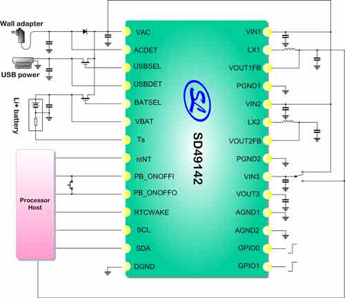 (產(chǎn)通社,4月30日訊)杭州士蘭微電子股份有限公司(Silan Microelectronics)發(fā)布了一款應(yīng)用于便攜式媒體播放器等系統(tǒng)的高性能集成電源管理芯片SD49142。該款芯片設(shè)計(jì)靈活,內(nèi)部集成了AC適配器/USB雙源鋰電池線性充電器、可動(dòng)態(tài)配置輸出電壓的兩路高效降壓型DC-DC轉(zhuǎn)換器、一路低壓差線性穩(wěn)壓器、電池監(jiān)測電路以及I2C通訊接口,為便攜式設(shè)備提供了一個(gè)完整的電源管理解決方案,從而使其性能得以充分發(fā)揮。
