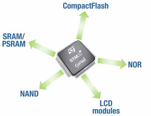 在配有256KB和更高閃存的微控制器中,增加的嵌入式外設接口包括一個靈活靜態(tài)存儲控制器(FSMC),它支持NOR閃存、NAND閃存、SRAM和CompactFlash存儲器。FSMC還支持英特爾的8080和摩托羅拉的6800液晶顯示板控制器并口模式。STM32微控制器還為移動存儲提供一個主設備接口,支持SD(安全數(shù)字)、SDIO(安全數(shù)字輸入/輸出)和MMC(多媒體卡)等,符合MultiMediaCard系統(tǒng)規(guī)范4.42的48MHz 8位數(shù)據(jù)傳輸速率要求。