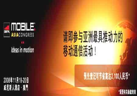 【產(chǎn)通社,10月8日訊】GSMA表示,移動通信亞洲大會(Mobile Asia Congress )由即日起開始接受出席登記。凡于10月17日前登記的人士,將會獲得預(yù)先登記的折扣優(yōu)惠。作為移動業(yè)人士,出席2008年11月18-20日于中國澳門特別行政區(qū)舉行的移動通信亞洲大會,您將親身體驗這次會議和展覽的價值所在。