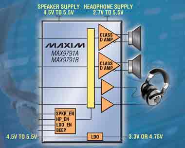 MAX9791/MAX9792的低功耗特性及內(nèi)置的高效D類放大器,使其在所有工作模式下均可有效延長(zhǎng)電池工作時(shí)間。此外,器件的高效率轉(zhuǎn)換極大地簡(jiǎn)化了AB類放大器在空間受限系統(tǒng)(如筆記本電腦)中經(jīng)常遇到的PCB散熱設(shè)計(jì)要求。IC的低EMI設(shè)計(jì)減小了筆記本電腦中多種輻射造成的干擾,低RF感應(yīng)特性確保在靠近無(wú)線系統(tǒng)時(shí)仍然能夠可靠工作。