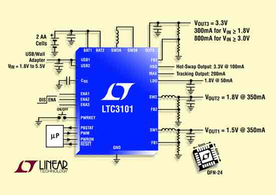 【產(chǎn)通社,12月5日訊】博達(dá)公關(guān)(EBA Communications)消息,凌力爾特公司(Linear Technology)推出了用于電池供電和后備電池應(yīng)用的多功能、緊湊型電源管理解決方案系列中的最新PMIC成員LTC3101。該微功率器件集成了一個(gè)低損耗電源通路控制器、三個(gè)高效率同步開關(guān)穩(wěn)壓器、一個(gè)電流限制為200mA的VMAX輸出(跟蹤較高電壓的輸入電源)、一個(gè)受保護(hù)的100mA熱插拔(Hot Swap)輸出、按鈕接通/關(guān)斷控制、一個(gè)可編程處理器復(fù)位發(fā)生器和一個(gè)始終保持接通的LDO。