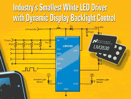 【產(chǎn)通社,8月27日訊】美國(guó)國(guó)家半導(dǎo)體公司(National Semiconductor)網(wǎng)站消息,其新型LM3530升壓轉(zhuǎn)換器堪稱業(yè)界最小的白光LED驅(qū)動(dòng)器,可以靈活控制顯示屏背光亮度。LM3530屬于PowerWise高能效芯片系列,可以驅(qū)動(dòng)高達(dá)11顆串聯(lián)的大電流LED,能夠?yàn)橹悄苁謾C(jī)等便攜式多媒體電子產(chǎn)品的大顯示屏提供充足的背光。