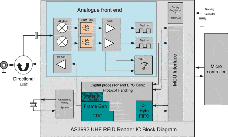 AS3992 UHF Gen 2讀卡器芯片是一個集成的模擬前端,具有符合ISO18000-6b/c 900MHz RFID讀卡器系統(tǒng)的協(xié)議處理能力。該器件配置了多個內(nèi)置編程選項,適用于各種UHF RFID應(yīng)用。