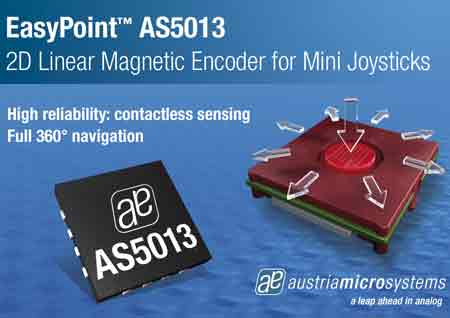 AS5013線性霍爾傳感器是一款非接觸式磁編碼器IC,可監(jiān)測(cè)與其中心位置相關(guān)的磁鐵的位移,并通過(guò)一個(gè)I2C界面提供x和y位置信息。奧地利微電子的AS5013霍爾傳感器IC被用于EasyPoint迷你操縱桿模塊中,該模塊由一個(gè)帶有導(dǎo)航旋鈕的機(jī)械模塊、一個(gè)小磁鐵和AS5013磁編碼器IC組成,其簡(jiǎn)單的結(jié)構(gòu)和非接觸式傳感技術(shù)讓模塊具有高可靠性,專為360度導(dǎo)航輸入設(shè)備設(shè)計(jì)。