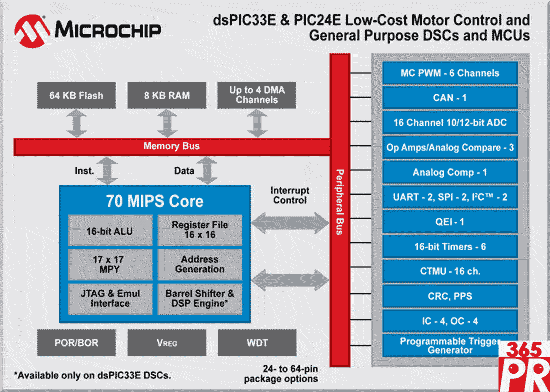 憑借70 MIPS的DSP性能和6通道脈寬調(diào)制(PWM)外設(shè),dsPIC33和PIC24“E”器件可執(zhí)行先進(jìn)電機(jī)控制和高速應(yīng)用。這樣就可以實(shí)現(xiàn)效率更高、體積更小、成本更低的設(shè)計(jì),用一個(gè)DSC或MCU即可控制整個(gè)系統(tǒng)。片上運(yùn)算放大器可用于各種需要信號調(diào)理的傳感應(yīng)用,而且減少了對外部元件的需求,有助于降低整體設(shè)計(jì)的成本和尺寸。用于mTouch容性觸摸傳感的CTMU外設(shè)還可簡化新穎而可靠的用戶界面,包括鍵盤、按鈕和滑動(dòng)條。