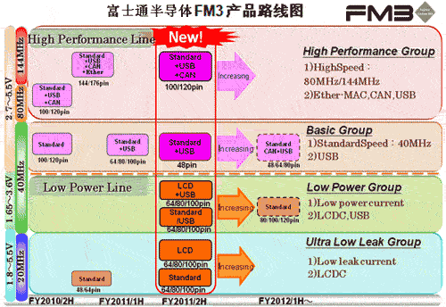 富士通半導體增加了旗艦型產(chǎn)品類型,并在速度、周邊外設、通信功能(如144MHz CPU內(nèi)核等)、周邊外設組合、可控制高達3個電機的變頻控功能、USB2.0和CAN等方面有所提高。所有功能設計均用來滿足市場對更高處理速度和多功能、多樣性的需求。
