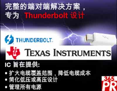 【產(chǎn)通社,3月30日訊】德州儀器 (TI) 官網(wǎng)消息,其推出了業(yè)界第一個用于優(yōu)化Thunderbolt技術(shù)的集成電路(IC)產(chǎn)品系列。該Thunderbolt高速接口標(biāo)準(zhǔn)支持雙10.3Gbps傳輸通道,將PCI Express與DisplayPort高度集成于單條線纜中,可通過統(tǒng)一線纜支持?jǐn)?shù)據(jù)傳輸與顯示。TI是唯一可提供完整器件生態(tài)環(huán)境的供應(yīng)商,提供理想的產(chǎn)品幫助客戶具備更多優(yōu)勢,加速采用Thunderbolt的設(shè)計。