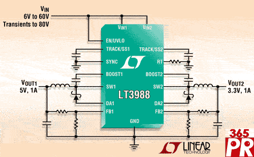 【產(chǎn)通社,4月20日訊】凌力爾特公司(Linear Technology Corporation)消息,其LT3988 60VIN降壓型開關(guān)穩(wěn)壓器可提供兩路1A輸出,在4V至60V的VIN范圍內(nèi)工作,具過壓閉鎖保護(hù),以免被高達(dá)80V的瞬態(tài)電壓損壞,從而非常適合在汽車應(yīng)用中常見的負(fù)載突降和冷車發(fā)動(dòng)情況。