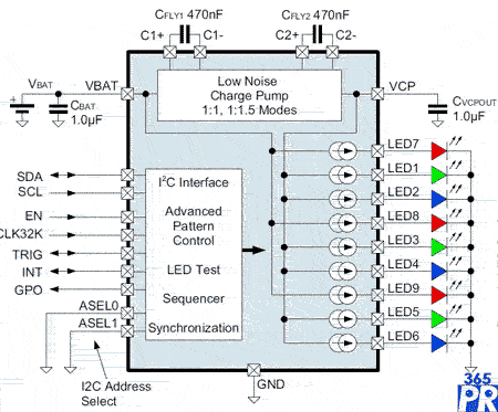 每個(gè)程序執(zhí)行引擎能驅(qū)動(dòng)1至9個(gè)LED。AS3661總共包含9個(gè)LED通道,每個(gè)通道驅(qū)動(dòng)電流高達(dá)25mA。9個(gè)通道中的每一個(gè)都有專用的12位PWM控制器,能進(jìn)行平滑的色彩轉(zhuǎn)換并實(shí)現(xiàn)線性、對(duì)數(shù)和比率方式的淡入淡出效果。