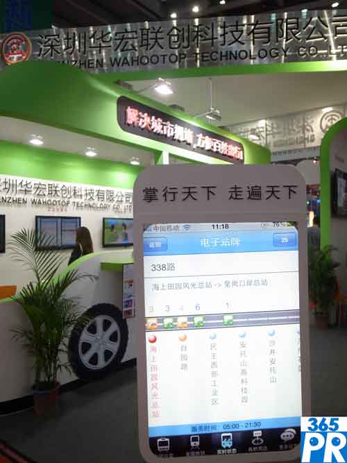 【產(chǎn)通社,11月22日訊】深圳華宏聯(lián)創(chuàng)科技有限公司展示的是“掌行天下,走遍天下”電子站牌,現(xiàn)場演示的由深圳皇崗口岸開往海上田園風(fēng)光總站的深圳338路公交車站牌。