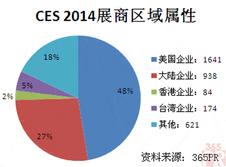 365PR從2003年以來就通過跟追CES展商及觀眾數(shù)據(jù),透視消費電子市場趨勢。統(tǒng)計顯示,在CES展商總數(shù)增加的同時,中國企業(yè)的“展商數(shù)量”在逐年下降,其中1201家中國企業(yè)參展了本屆展覽,包括已經(jīng)走出國門的TCL、聯(lián)想、中興、海爾、海信等,以及938家大陸企業(yè),84家香港企業(yè),174家臺灣企業(yè);在2013年,中國參展企業(yè)總數(shù)為1287家;2012年該數(shù)字為1380家。
