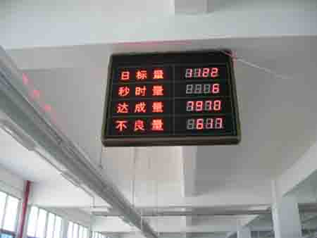 | LED數(shù)字管理顯示屏(電子看板)是專門為生產(chǎn)型企業(yè)設(shè)計的生產(chǎn)流水線數(shù)字顯示屏,用于標(biāo)示當(dāng)天或當(dāng)班的計劃生產(chǎn)量、實際生產(chǎn)量、差異值、不良品、達(dá)成率、不良率等參數(shù)。其中計劃生產(chǎn)量等可以由計算控制輸入、鍵盤輸入或遙控輸入,實際生產(chǎn)量,不良品等通過檢測安裝在生產(chǎn)線上的紅外感應(yīng)開關(guān)、行程開關(guān)等自動錄入或通過按鍵錄入,差異值、達(dá)成率、不良率等由看板內(nèi)部的單片機計算并顯示出來。LED數(shù)字管理看板的應(yīng)用將有利于提高企業(yè)管理水平、降低企業(yè)的勞動力成本、激發(fā)員工的生產(chǎn)積極性等從而使企業(yè)獲得更大的利潤空間。