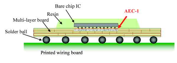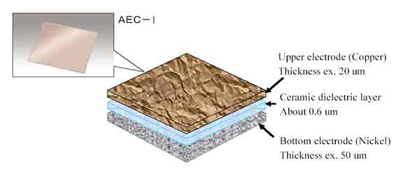 該產(chǎn)品能夠以與使用覆銅板的普通多層底板基本相同的制造方法封裝在底板上。具體做法是,首先,通過(guò)蝕刻將所需靜電容量和形狀的電極以及連接端子等刻到AEC-1內(nèi)外的金屬箔上。然后使用樹脂通過(guò)熱壓接等將已設(shè)計(jì)好電路的覆銅板與金屬箔貼合在一起。由于陶瓷層很薄,處理時(shí)多少會(huì)產(chǎn)生一些變形,但只要不起褶,電氣特性就不會(huì)改變。