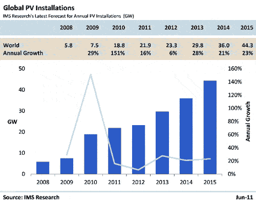 IMS Research數(shù)據(jù)顯示,2010年全球太陽能光伏安裝量年增長(zhǎng)151%達(dá)到18.8GW規(guī)模,2011年可增長(zhǎng)16%至21.9GW左右,2012年增長(zhǎng)速度將減緩,但是2014年以后將恢復(fù)較快增長(zhǎng)速度,并在2030年之前成為主流能源利用形式。